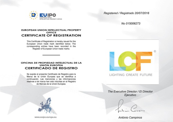 2016.11.09,米兰milan“LCF”商标通过了欧盟商标委会员的审核,正式通过申请并核发了商标注册证书,“LCF”通过了第9类、第11类、第35类的商标注册,标志着“LCF”向国际知名品牌的目标又有了一个历名性的飞跃,为“LCF”品牌在欧洲市场起到了更为全面的保护。